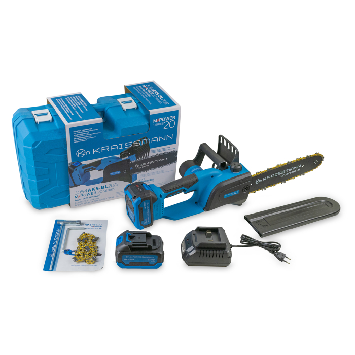 Акумуляторна ланцюгова пила KRAISSMANN 3054 AKS-BL 20/2 належить до бездротових інструментів, що використовують універсальну акумуляторну батарею та універсальний зарядний пристрій серії M-POWER.