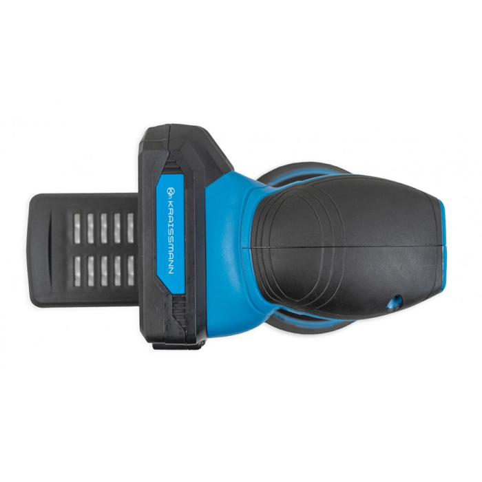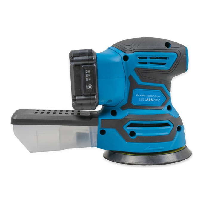 Акумуляторна орбітальна шліфмашина працює від іонно-літієвого акумулятора ємністю 2000 мАг. KRAISSMANN 1251 AES 20/2 оснащена системою пиловідведення і зберігає робоче місце в чистоті.