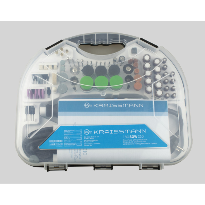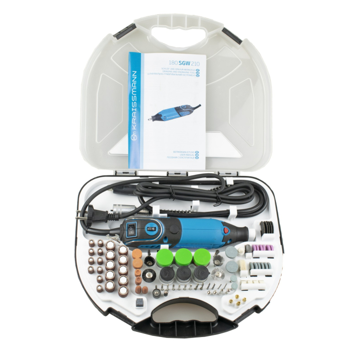 Гравер KRAISSMANN 180 SGW 210 виконає точне та акуратне гравіювання, шліфування або свердління в найрізноманітніших матеріалах. Функція регулювання обертів дозволяє налаштувати інструмент для конкретного матеріалу та виду роботи. У наборі передбачений гнучкий вал, що дозволяє виконати вимогливе до особливої точності завдання, а також комплект найпопулярніших насадок. Кнопка фіксації шпинделя дозволить зручно та швидко змінити оснащення.