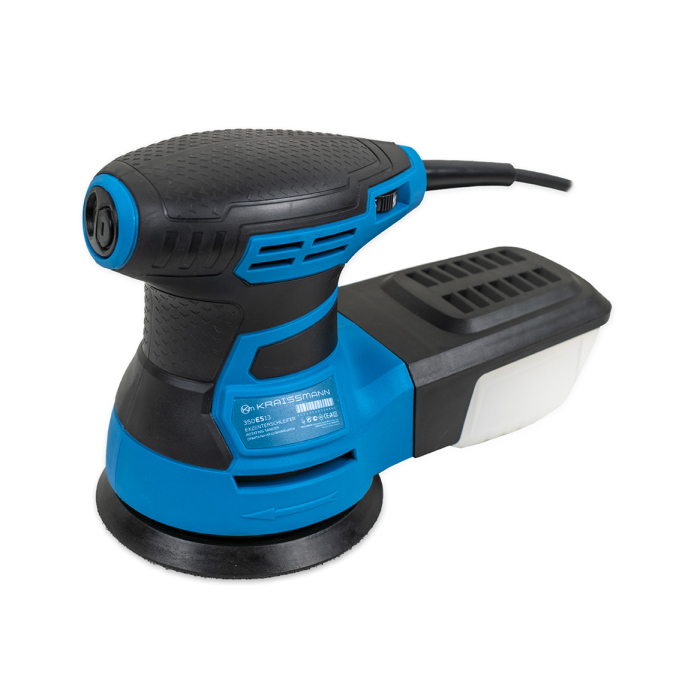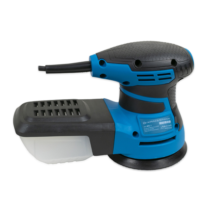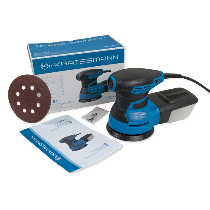 Орбітальна (ексцентрикова) шліфувальна машина KRAISSMANN 350 ES 13 проста, але надійна в експлуатації і відмінно справляється зі шліфуванням поверхонь з різних матеріалів, видаленням старого лаку, фарби, слідів іржі. Прогумовані рукоятка і корпус запобігають ковзанню і забезпечують міцний хват, так само знижуючи рівень вібрації. KRAISSMANN 350 ES 13 оснащена системою пиловідведення і зберігає робоче місце в чистоті, передбачена можливість підключення пилососа. Для тривалої роботи кнопка ввімкнення може бути зафіксована.
