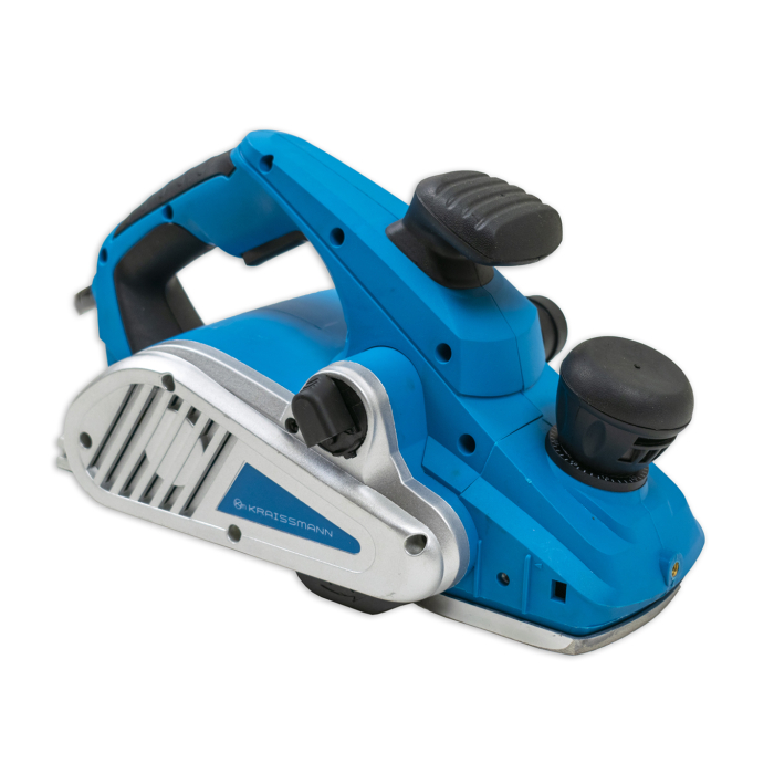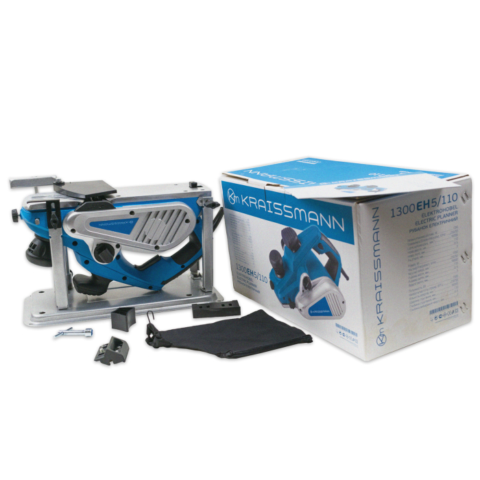 Рубанок KRAISSMANN 1300 EH 5/110 може використовуватися як ручний рубанок, так і встановлюватися на поверхню робочого столу (кріплення і станина входять до комплекту). Глибина стругання може регулюватися від 0 до 5 мм, глибина обраної чверті до 3 мм. Рубанок оснащений ножами високої якості, які можуть надалі заточуватися для повторного використання. Бічні панелі корпусу виконані з металу. Рукоятка з гумовими накладками забезпечує комфортний хват під час роботи. Пластиковий обмежувач на платформі запобігає контакту ножів з поверхнею в неробочому стані. KRAISSMANN 1300 EH 5/110 відмінно підійде і для побутових завдань, і для роботи на виробництвах.