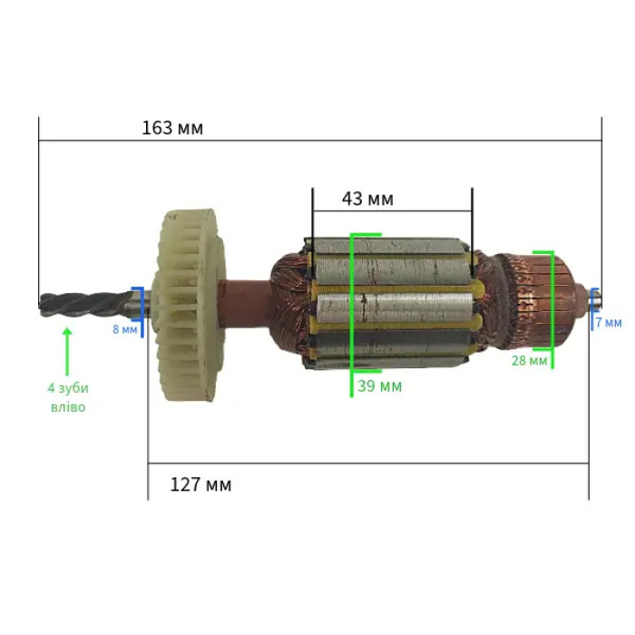 Якір для дриля УРАЛМАШ 1050Характеристика:Діаметр пакета: 39 ммДовжина пакета: 43 ммДіаметр колектора: 28 ммЗагальна довжина: 163 ммМіж підшипниками: 127 ммДіаметр верхнього підшипника: 8 ммДіаметр нижньог...